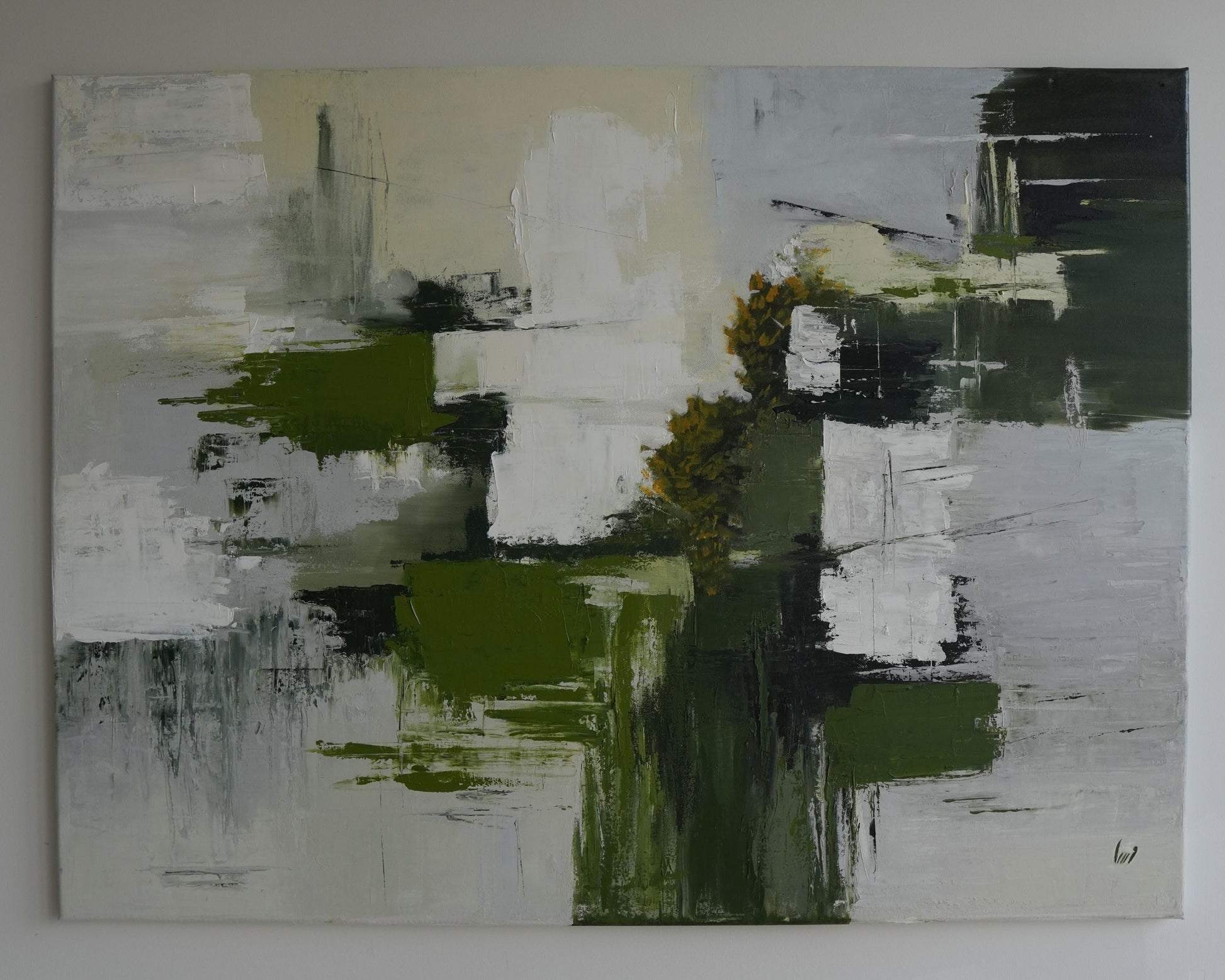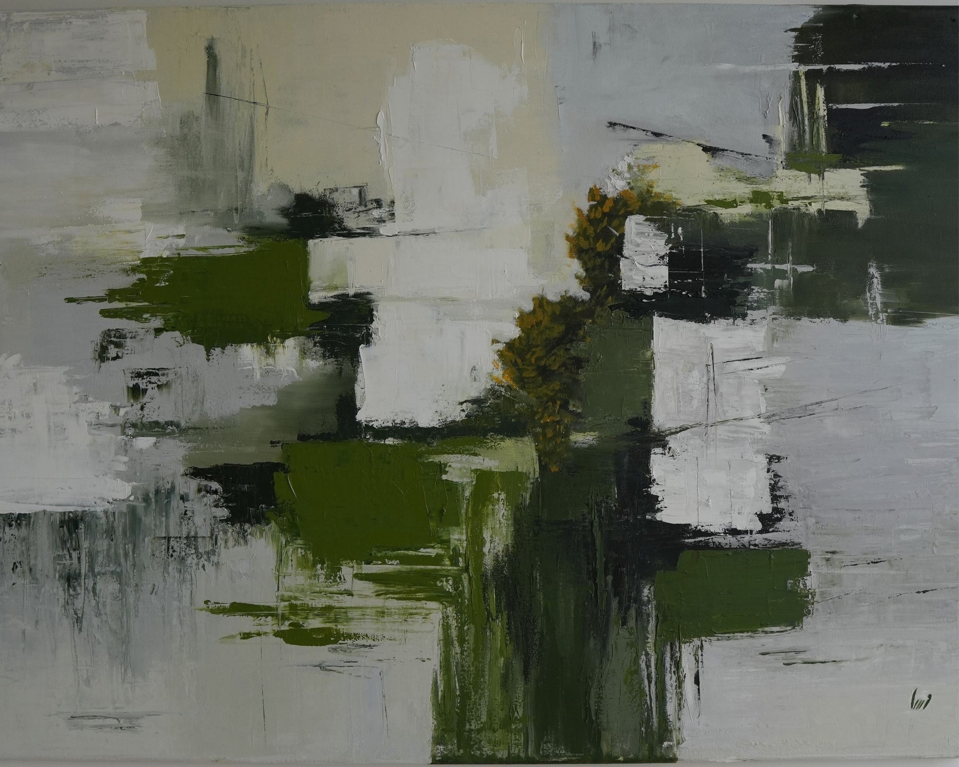 A large abstract landscape in greens, whites, and greys with bold palette knife strokes. A golden tree form emerges from the textured layers, evoking the fresh energy of spring.