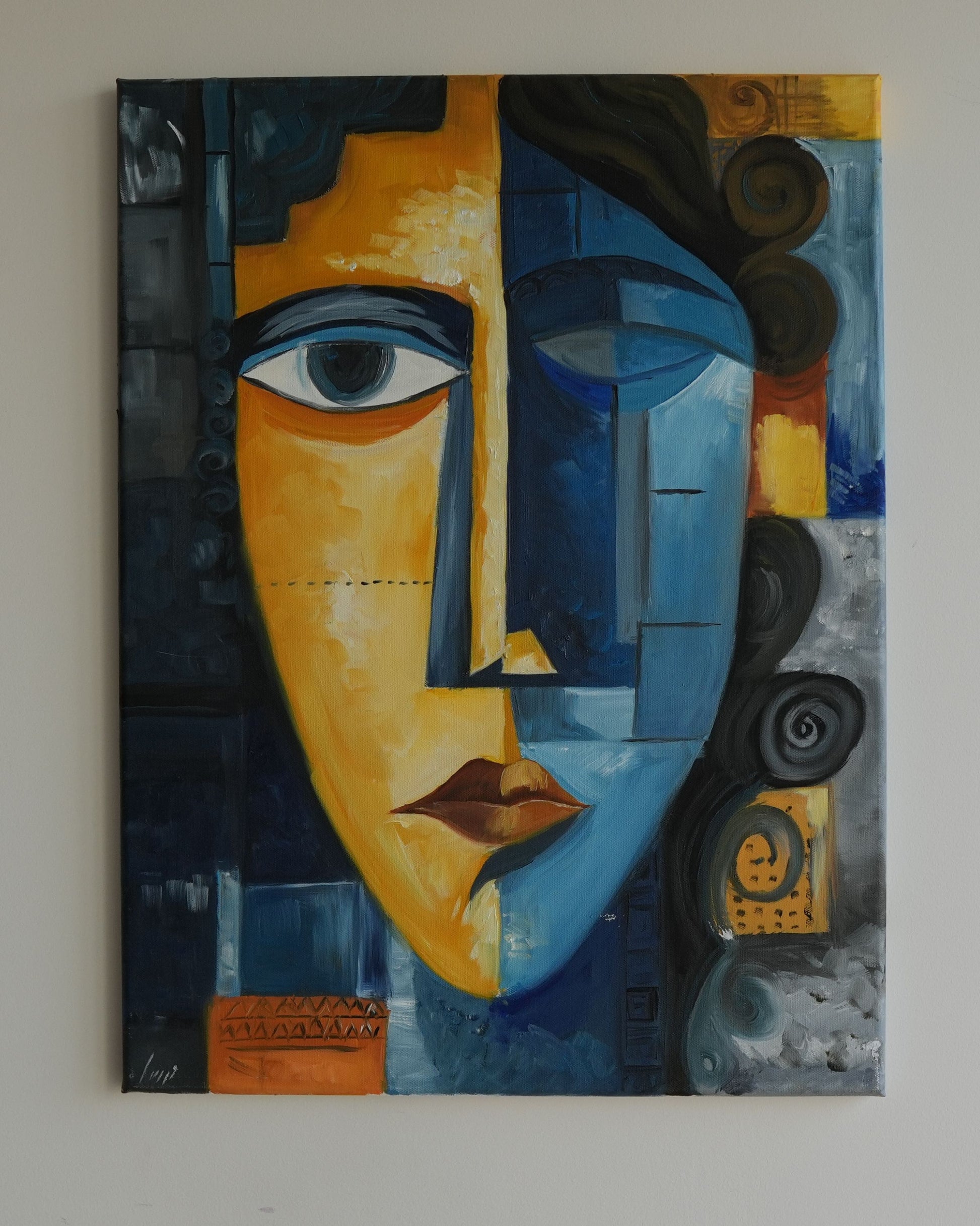 Bold cubist portrait in vibrant yellows, blues, and oranges. Fragmented geometric forms and decorative spirals create a striking face with unmistakable Picasso influence. A statement piece with strong visual impact.