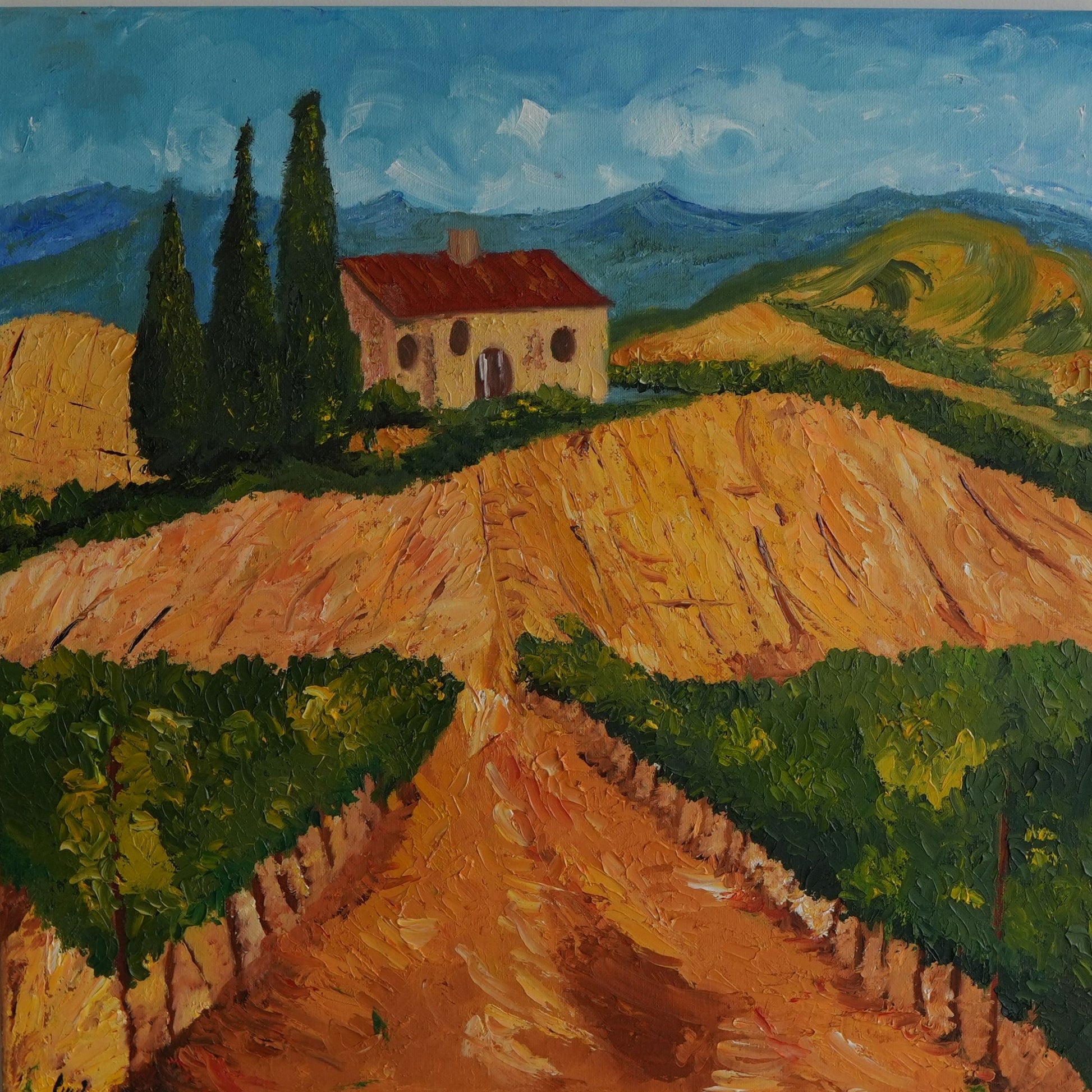 A Tuscan landscape with rolling golden hills, cypress trees, and a farmhouse with a terracotta roof. Thick impasto brushwork in the style of Van Gogh brings movement to the vineyards and distant mountains.