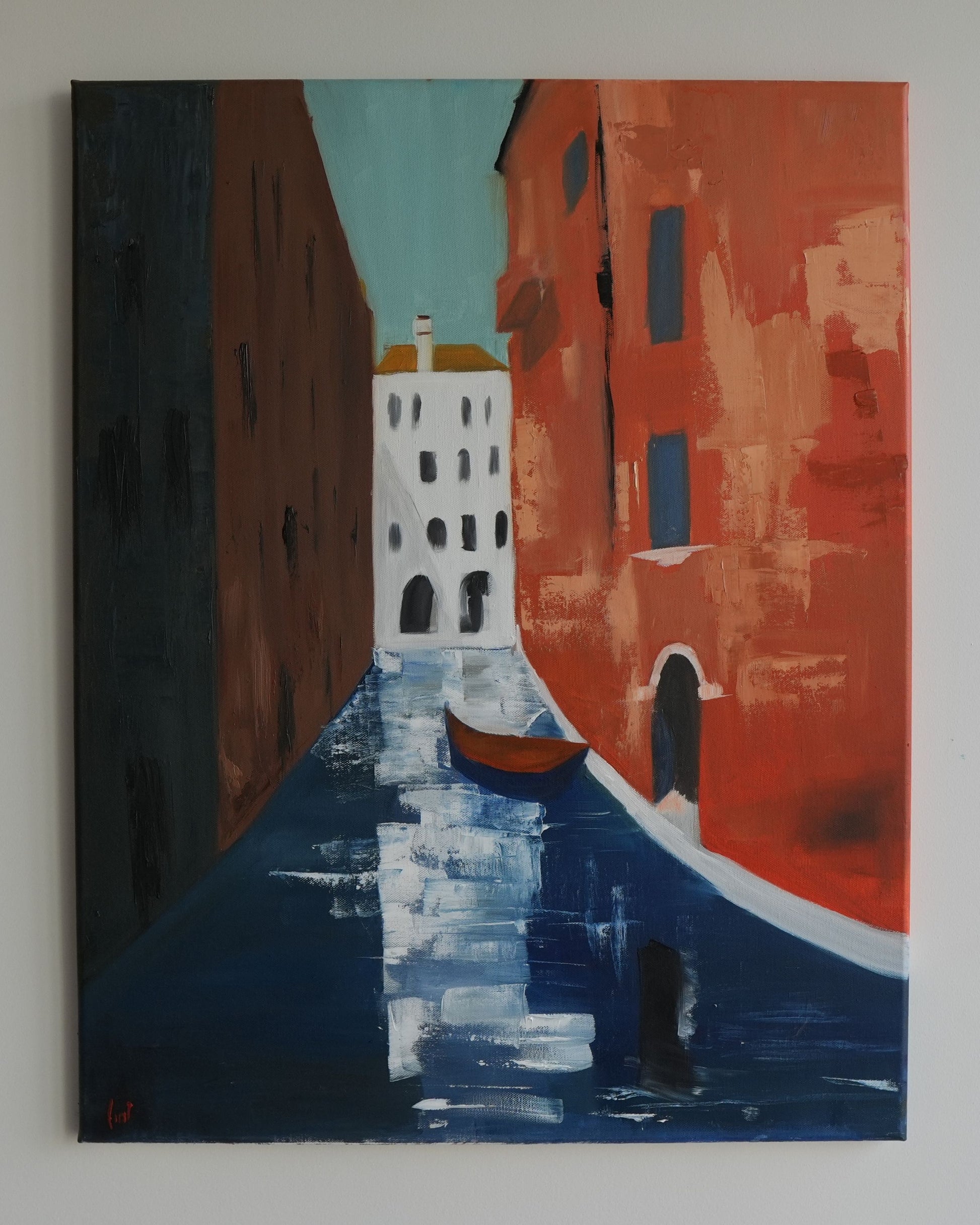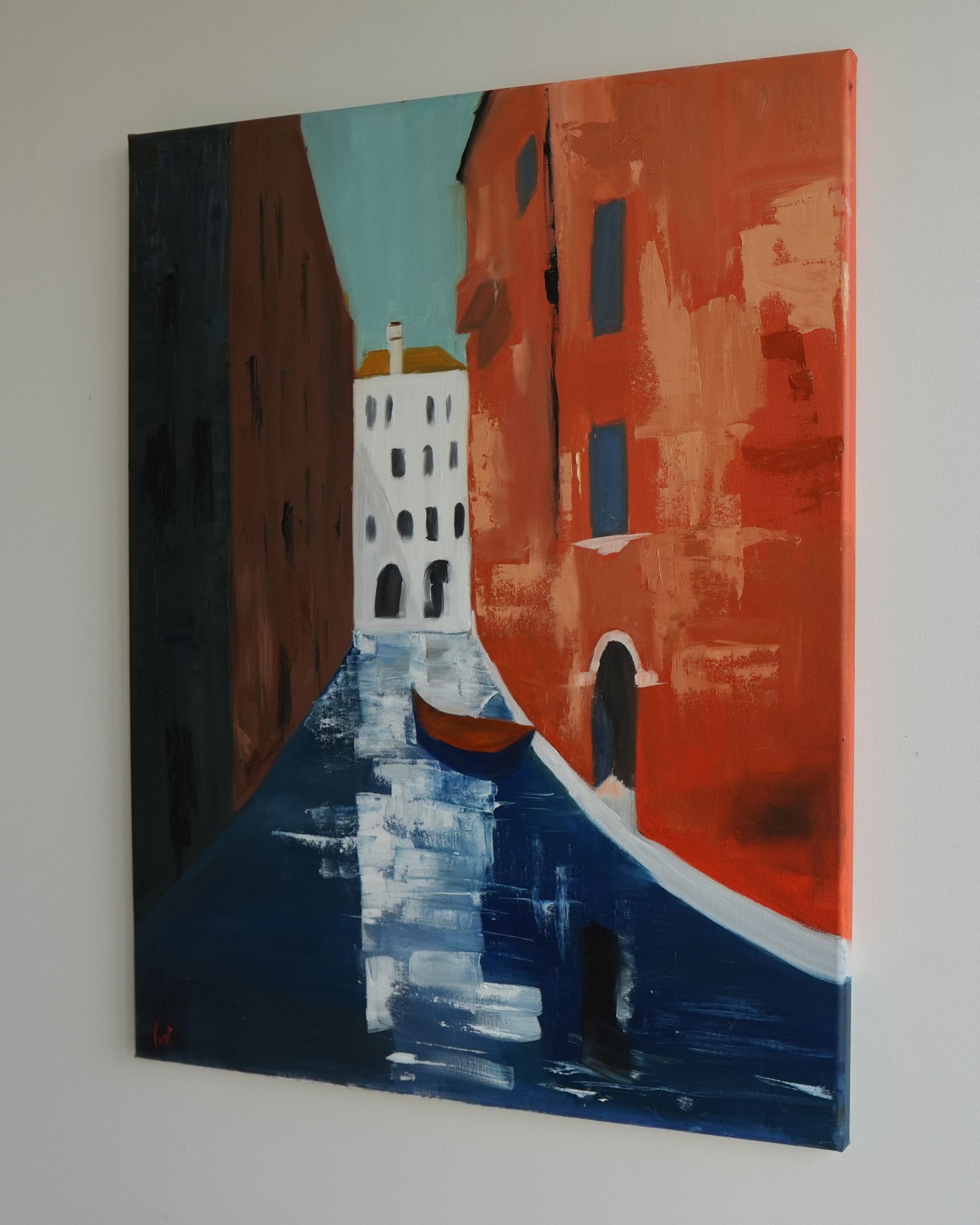 A Venice canal scene with bold, expressive brushwork. Terracotta and ochre buildings frame a narrow waterway, with a lone boat and light reflections on deep blue water. A white building with a golden roof draws the eye at the end of the canal.